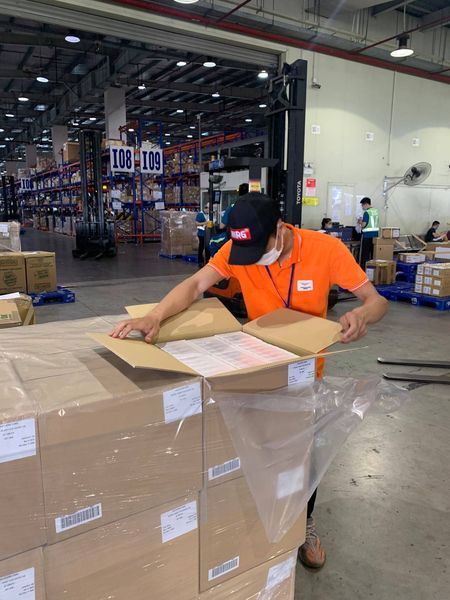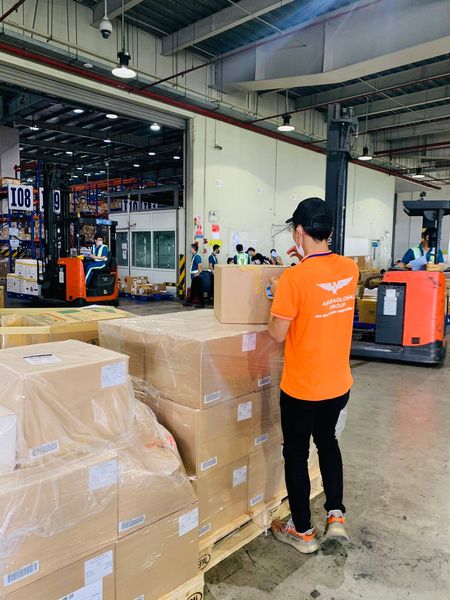 Hình ảnh làm hàng thực tế tại kho Nội Bài 20.05.2021: Mở hàng chuẩn bị kiểm hoá và sau khi kiểm xong dán tem niêm phong lại