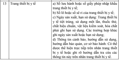 Theo Phụ lục I Nghị định số 43/2017/NĐ-CP quy định Nội dung bắt buộc phải thể hiện trên nhãn theo tính chất của hàng hóa đối với từng nhóm hàng hóa. Ở mục số 13 ghi rõ, đối với trang thiết bị y tế, yêu cầu nội dung bắt buộc như sau: