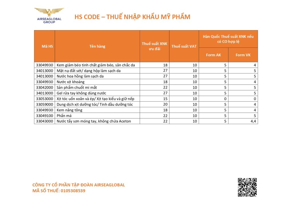 Danh mục chi tiết Thuế nhập khẩu các loại Mỹ phẩm Airseaglobal trực tiếp thông quan:
