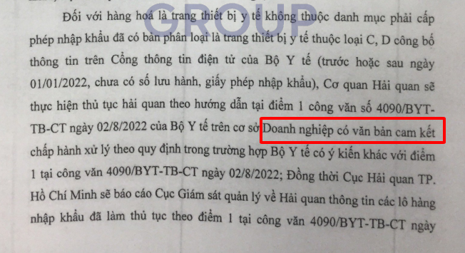 Theo Công văn 2687/HQTPHCM-GSQL, doanh nghiệp có hàng loại C,D không thuộc Thông tư 30 muốn thông quan cần có BẢN CAM KẾT CHẤP HÀNH XỬ LÝ THEO QUY ĐỊNH trong trường hợp Bộ Y tế có ý kiến khác với quan điểm 1 tại Công văn 4090.