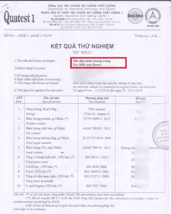 BẢN KIỂM NGHIỆM SỮA ĐẬU NÀNH