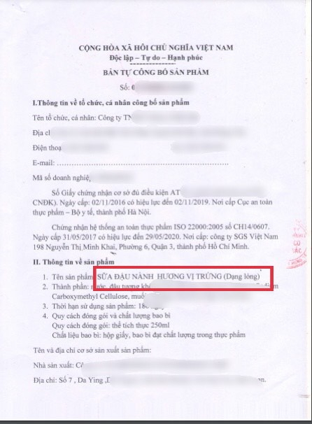 BẢN TỰ CÔNG BỐ SỮA ĐẬU NÀNH
